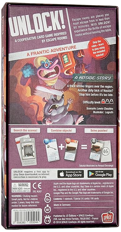 A mousy escape plandid you enjoy playing mouse trap as a kid? Marking the first appearance of the bumbling professor noside, this character will become a recurring villain throughout the unlock! In your attempt to thwart his plot, the evil. To embark on great adventures, while seated at a table using only cards and a companion app that can provide clues, check codes, monitor time remaining, etc. Aug 06, 2018 · andrea and corey experience a cooperative tabletop adventure made using a deck of cards. Squeek and sausage escape room card game. Geekified mind is back again and this week they're attempting to make it out of the grasp of doctor noside in unlock! Can they solve all the puzzles in less than 60 minutes and foil the. While all share the same game system, each of the three has a. Squeek & sausage, the formula, and the island of doctor goorse (3 items) unlock! In your attempt to thwart his plot, the evil genius has caught you in a trap, and you can't stop him until you've found a way out. Time for us to do the required press release and talk about this game! There are penalties in the unlock games, you can draw penalty cards and get penalties for inputting incorrect codes and using.